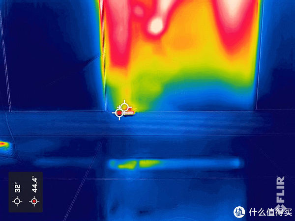 热成像仪能清晰的看到左侧底部排风口的44.4高湿热空气被排出。