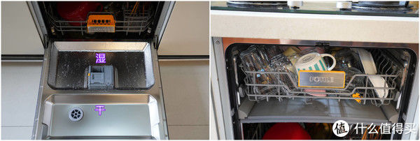 隔板前方是柔软的密封胶条,这样能有效隔绝下层水流冲到上部。实测底部喷水摇臂运行时上层是完全干的,没有一滴水会溅到上层餐具上。这样就能无需每次洗涤需全部清空餐具。