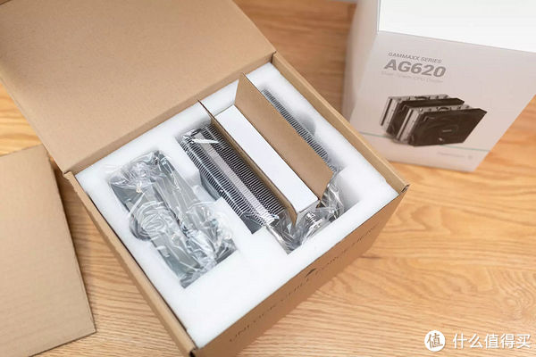 PA120包装内部采用了泡沫框架,单层收纳,散热器和风扇单独摆放,配件盒加持在散热塔的中间。
